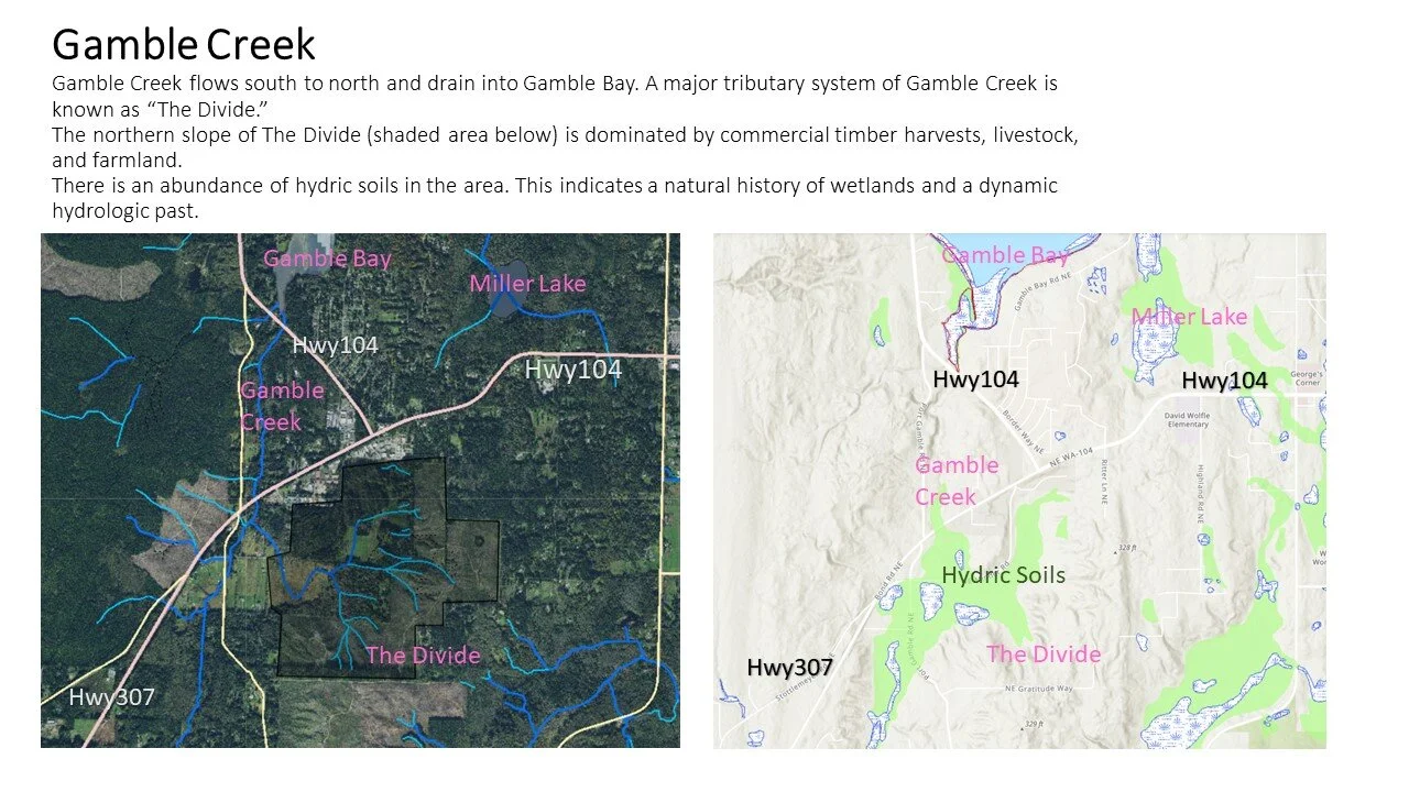 Gamble Creek is the largest creek draining into the Gamble Bay and has been subject to countless human-caused degradations to the watershed. Restoring, enhancing, and preserving the Gamble Creek watershed will benefit the town, the tribe, outdoor recreationalist, the substantial shellfish beds, the salmon runs, and innumerable wildlife species that call the area home.